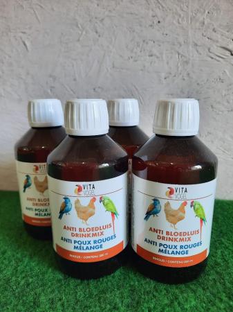 Anti bloedluis drinkmix : preventie en behandeling van bloedluis, rode mijt...![]() Anti bloedluis drinkmix is een aanvullend vloeibaar diervoeder voor alle vogelsoorten en kippen dat in het water gedoseerd kan worden, toe te voegen aan het drinkwater van uw pluimvee. Anti bloedluis drinkmix stimuleert het immuunsysteem van de vogel/kip zodanig dat er een eiwit geproduceerd wordt dat niet verteerbaar is voor de bloedluis. Het bloed van de bloedluis stolt door het opnemen van het bloed van de vogel/kip. Anti bloedluis drinkmix draagt eraan bij dat de vogel/kip minder stress gevoelig is. Anti bloedluis drinkmix bevat een mengsel van kruidenextracten en vitamine C. De combinatie van deze kruiden ondersteunt het immuunsysteem en ondersteund het herstellend vermogen van de huid. Curatief gebruik: Doseer 10 ml Anti Bloedluis Drinkmix op 1 liter water gedurende 5-7 dagen. Preventief kan Anti Bloedluis Drinkmix continue gebruikt worden, wij adviseren dit 2 dagen per week toe te dienen.